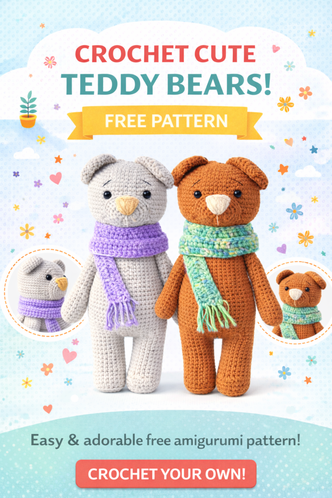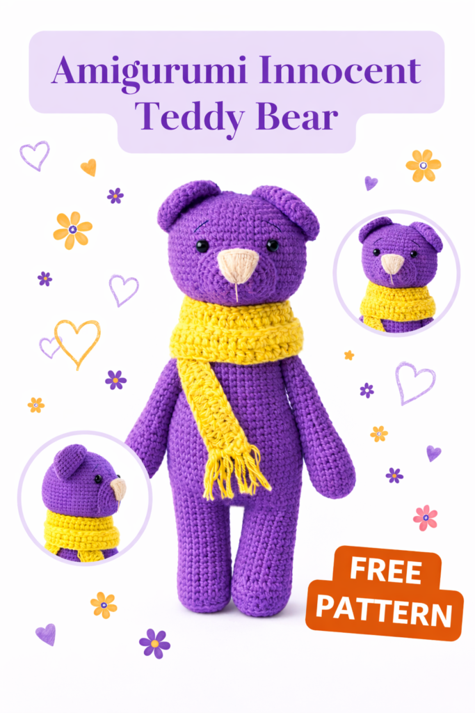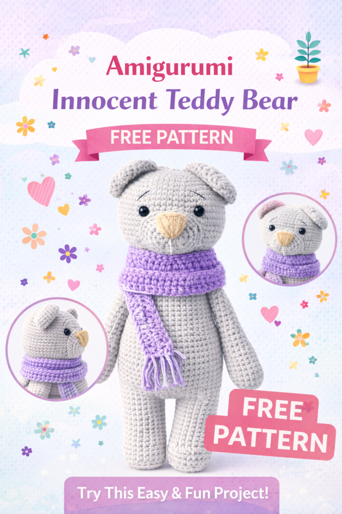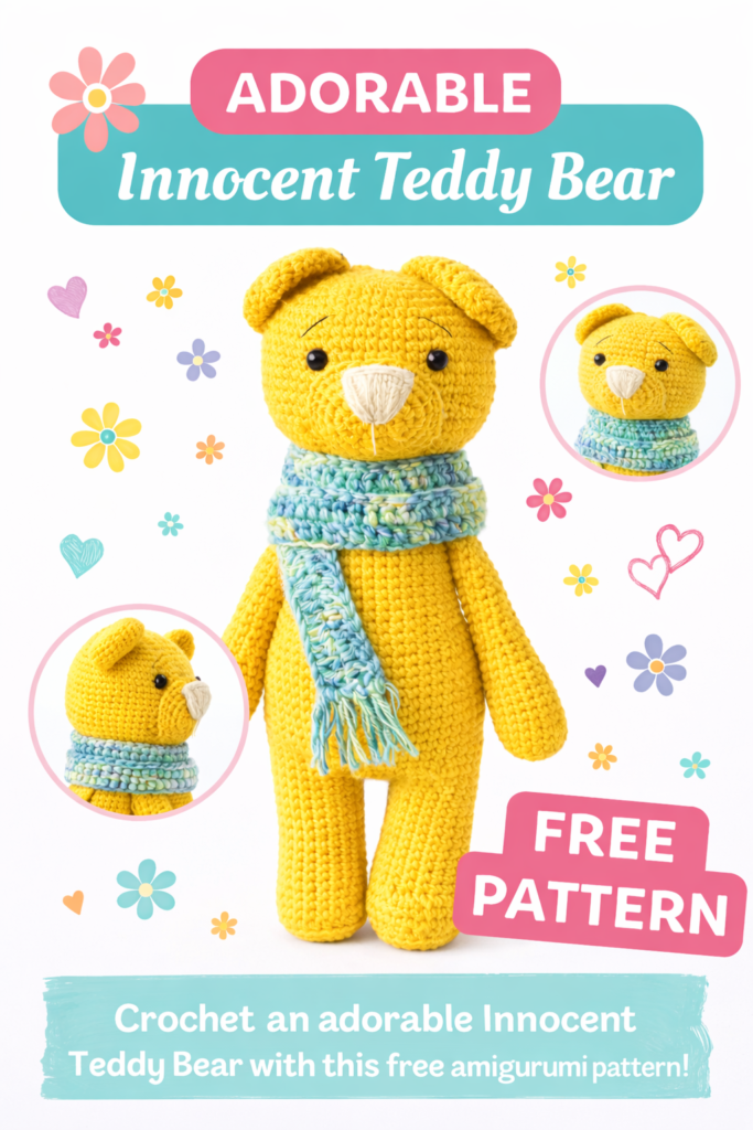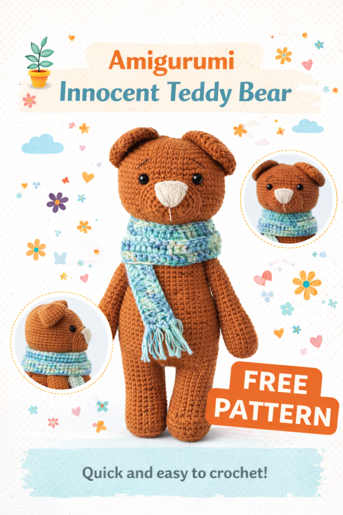 Save this pin to try the Innocent Teddy Bear Amigurumi Pattern later and create your own adorable teddy bear. With clear instructions and an easy structure, this Innocent Teddy Bear Amigurumi Pattern is a fun and relaxing crochet project you’ll love.